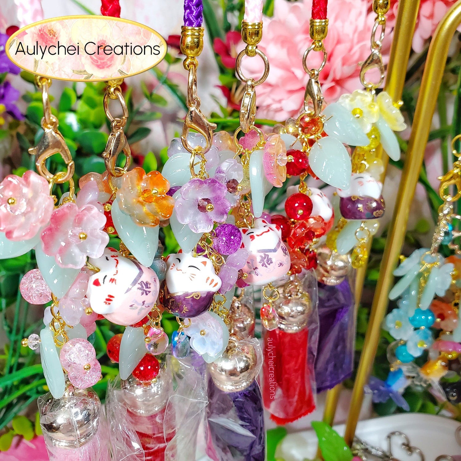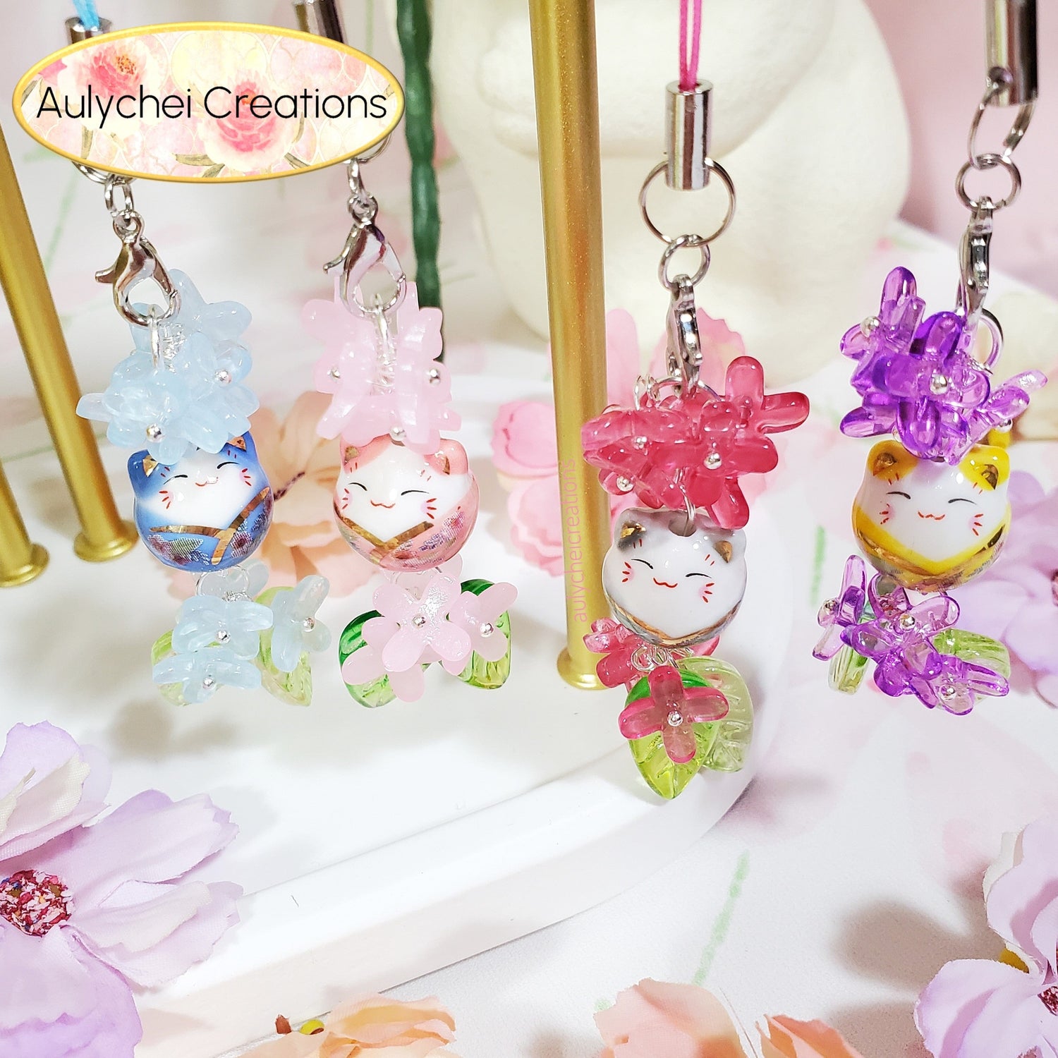 These beautiful handmade osmanthus ceramic cat flower bead keychains feature a cheeky...
