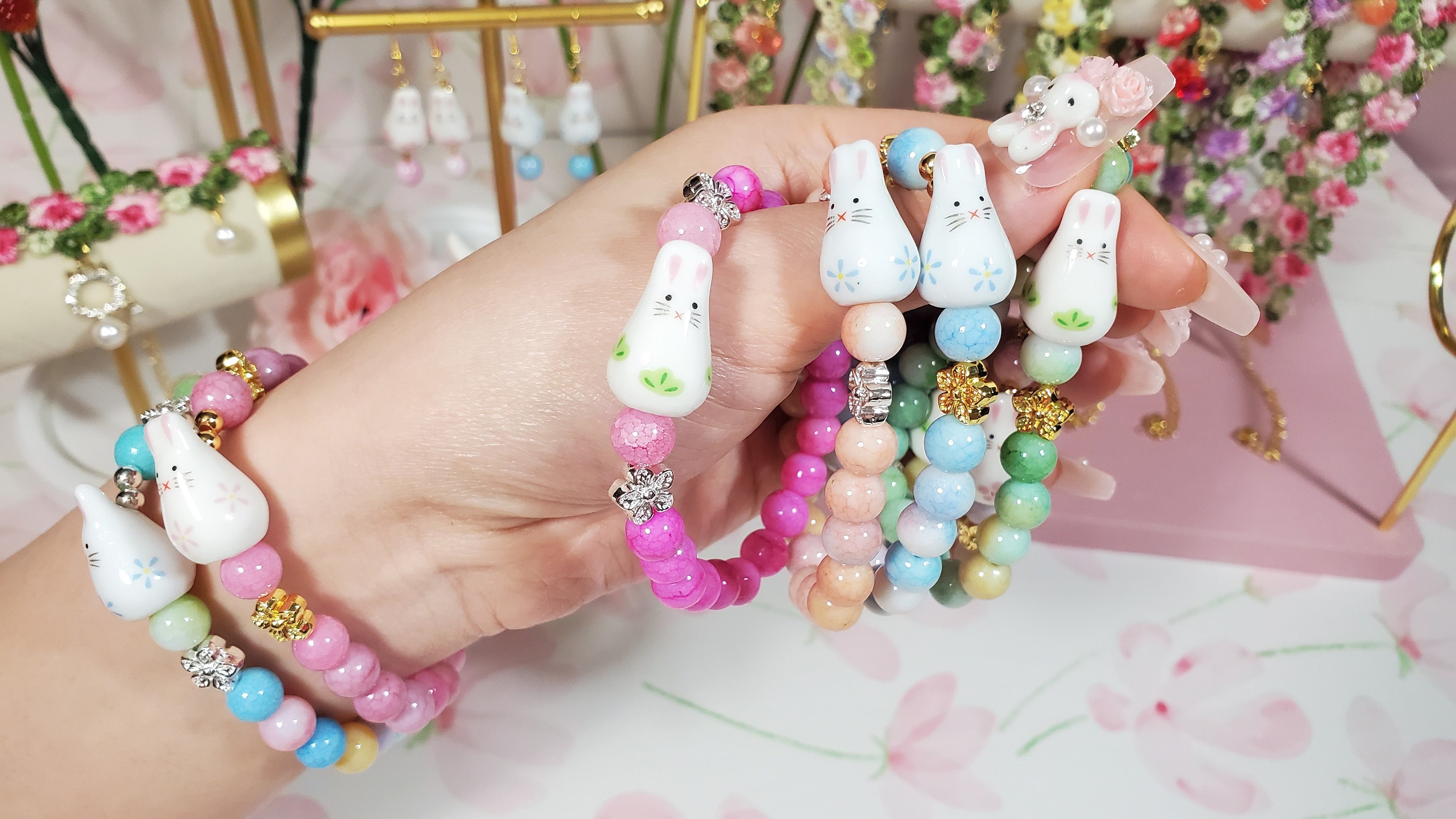 Ceramic Bunny Rainbow Glass Bead Bracelet