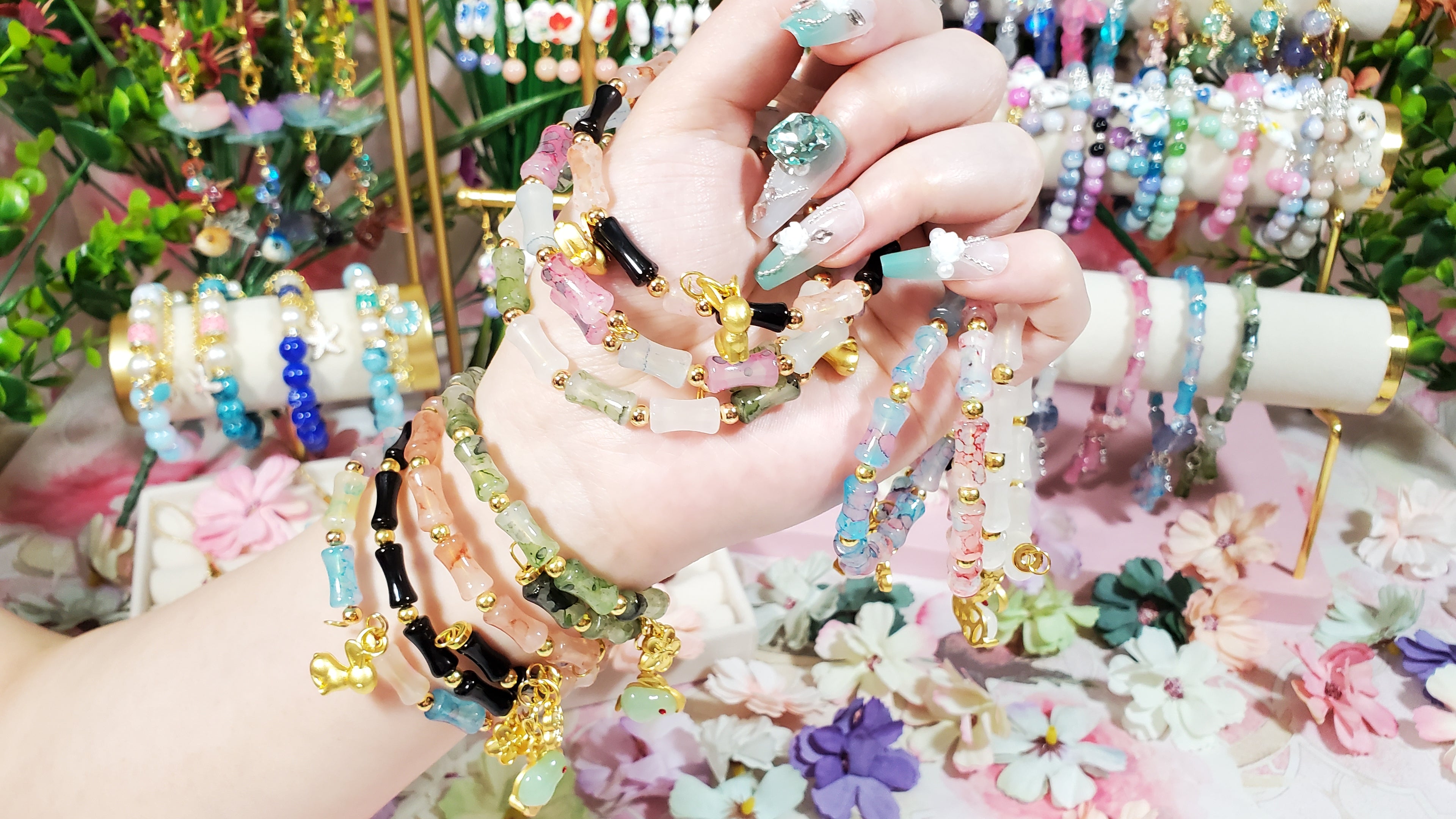 Blue-Pink Bamboo Glass Bead Bracelet Jade Rabbit