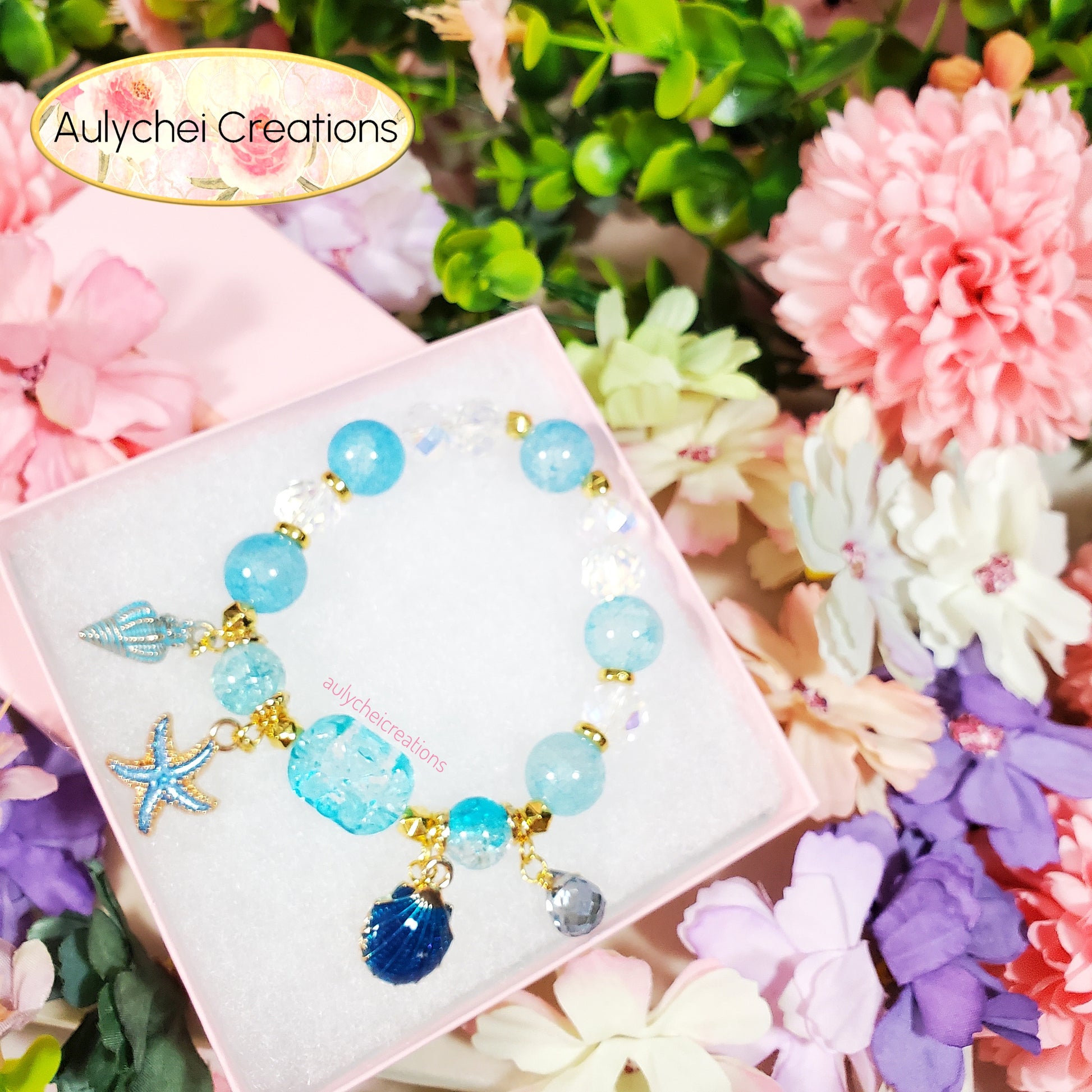 Capture the beauty of the ocean at sunset with our exquisite seashell charm bracelet. Featuring 10-12mm glass beads and sparkling crystal accents, this bracelet is adorned with charming enamel seashell charms and a statement glass charm pendant. Add a touch of ocean inspiration to any outfit.