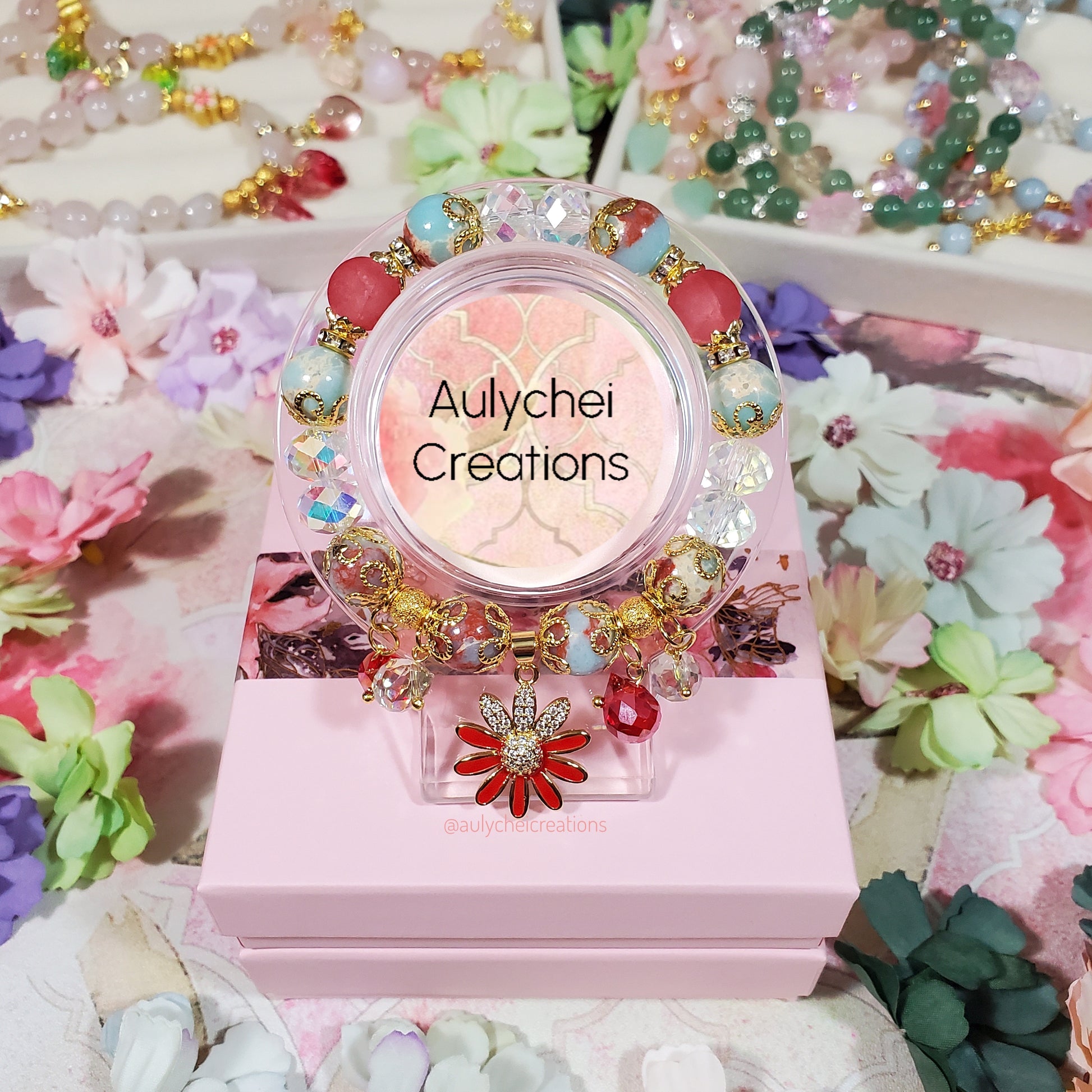 Blue Jasper Gemstone Bracelet with 18K Daisy Enamel Charm