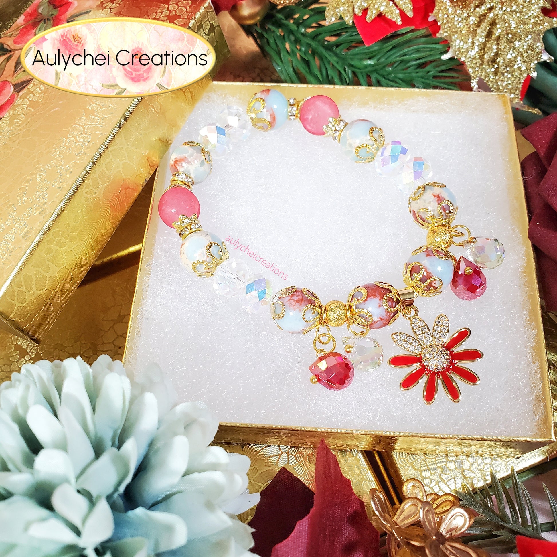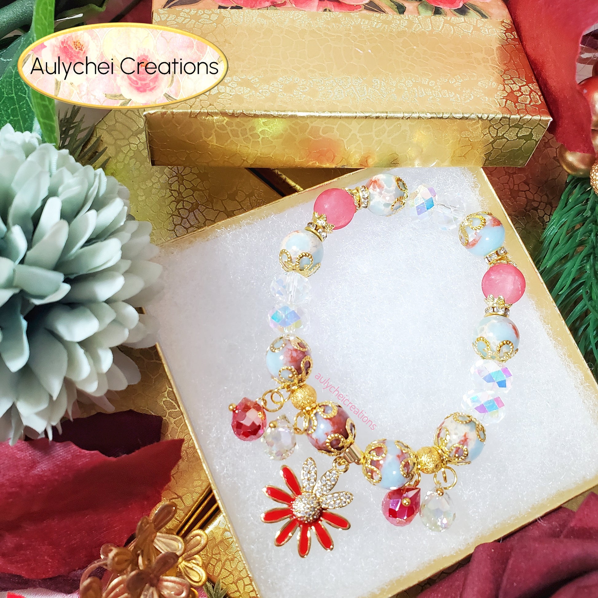 Experience wisdom and empowerment with our Gemstone Blue Jasper Beaded Bracelet! The beautiful blue jasper gemstones are complemented by vibrant frosted red glass beads and sparkling crystal dangles. With 18K stardust spacers and an elegant 18K enamel daisy charm, this bracelet exudes both vibrancy and elegance.