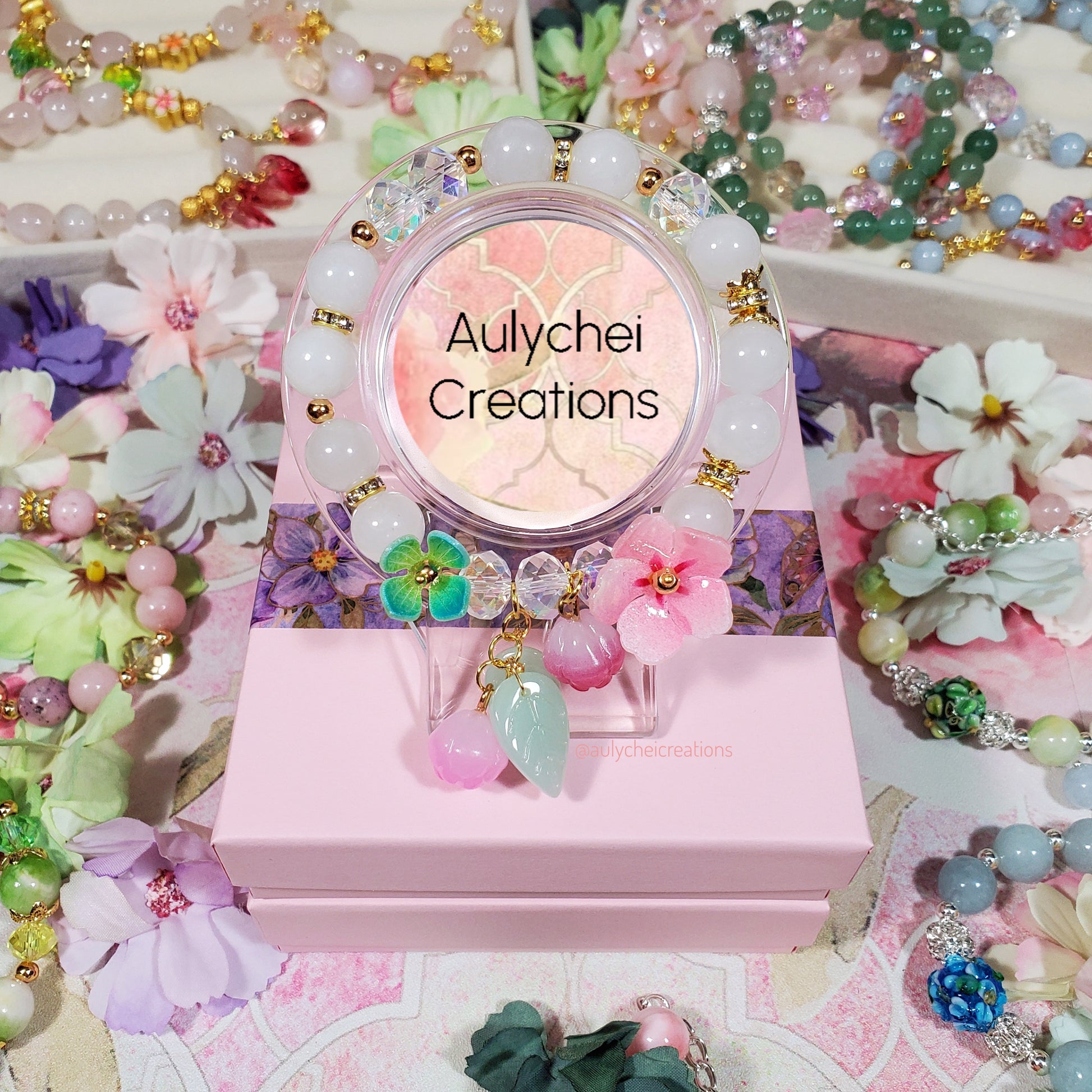 This white jade gemstone bracelet is designed with a beautiful resin cherry blossom motif, glowing glass blossom buds, and 18k gold spacers, this bracelet exudes an exquisite and elegant aesthetic. Let peaceful and calming white jade gemstones and delicate glass leaves inspire you to blossom.