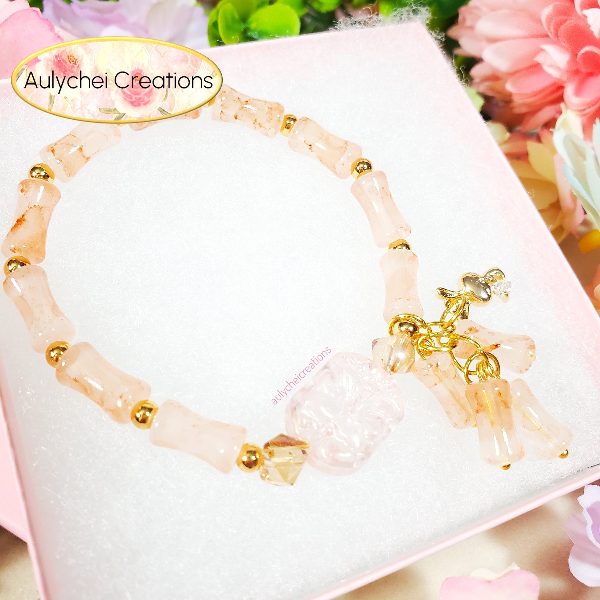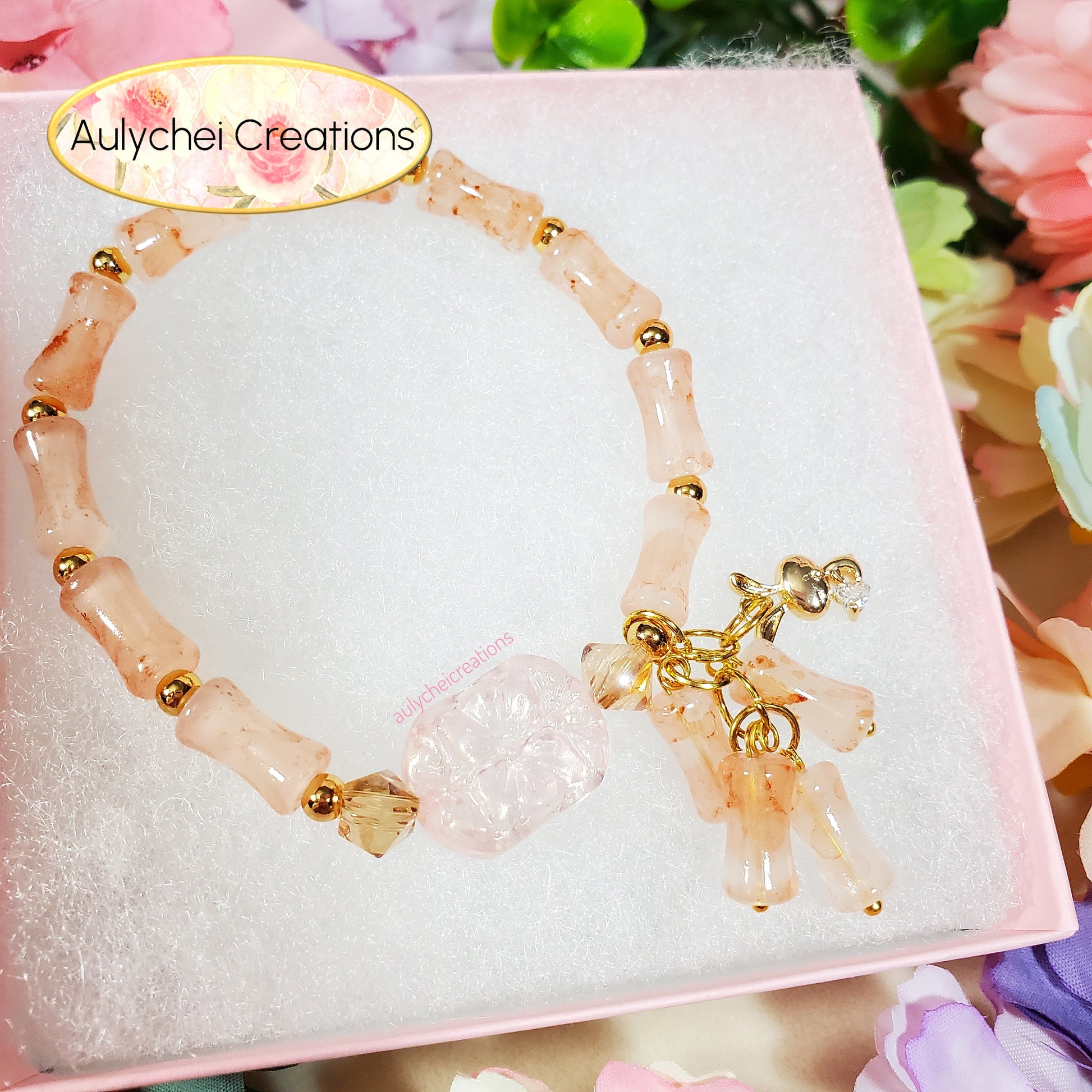 Peach Bamboo Glass Bead Bracelet Flower Pendant