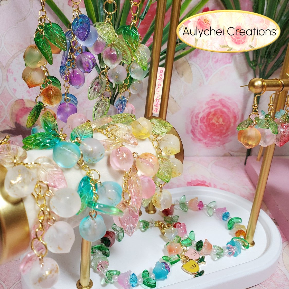 Indulge in the sweet, summertime charm of our Peach Glass Bead Dangle Bracelet. Adorned with delicate glass peaches and leaves, frosted beads, and sparkly gold spacers, this bracelet exudes a youthful and fresh energy. Let the bunches of peaches and spring blossoms inspire your senses and add a touch of sweetness to any outfit.