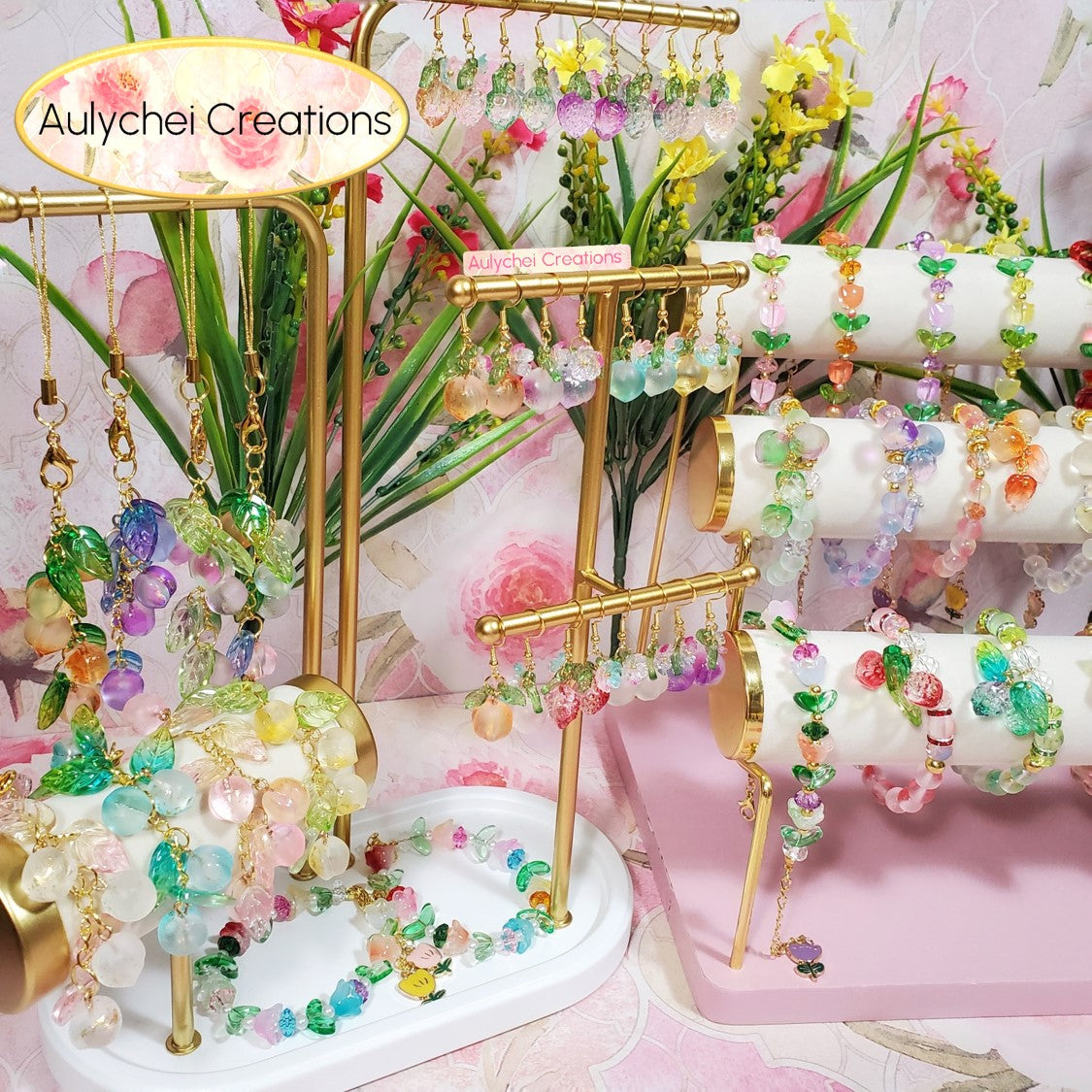 Indulge in the sweet, summertime charm of our Peach Glass Bead Dangle Bracelet. Adorned with delicate glass peaches and leaves, frosted beads, and sparkly gold spacers, this bracelet exudes a youthful and fresh energy. Let the bunches of peaches and spring blossoms inspire your senses and add a touch of sweetness to any outfit.