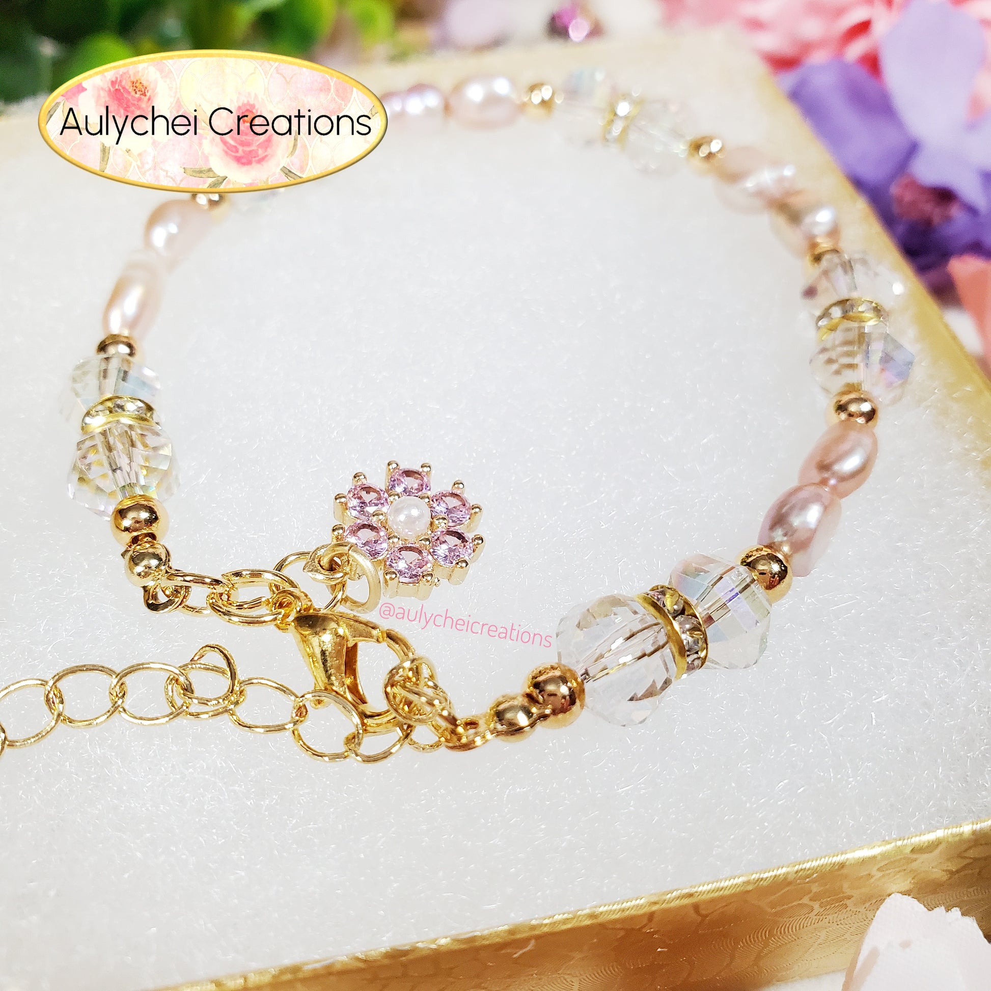 Beauty of Beads: 7 - 8mm Pink Freshwater Cultured Pearls, Cubic Zirconia Flower Bracelet Charm, Crystal Bead Accent, Elegant 18K Gold Spacers, Rhinestone Spacers, Minimalistic Design, Lobster Clasp with Ext. Tail Chain, 7 - 7.5 inches fits most wrist sizes