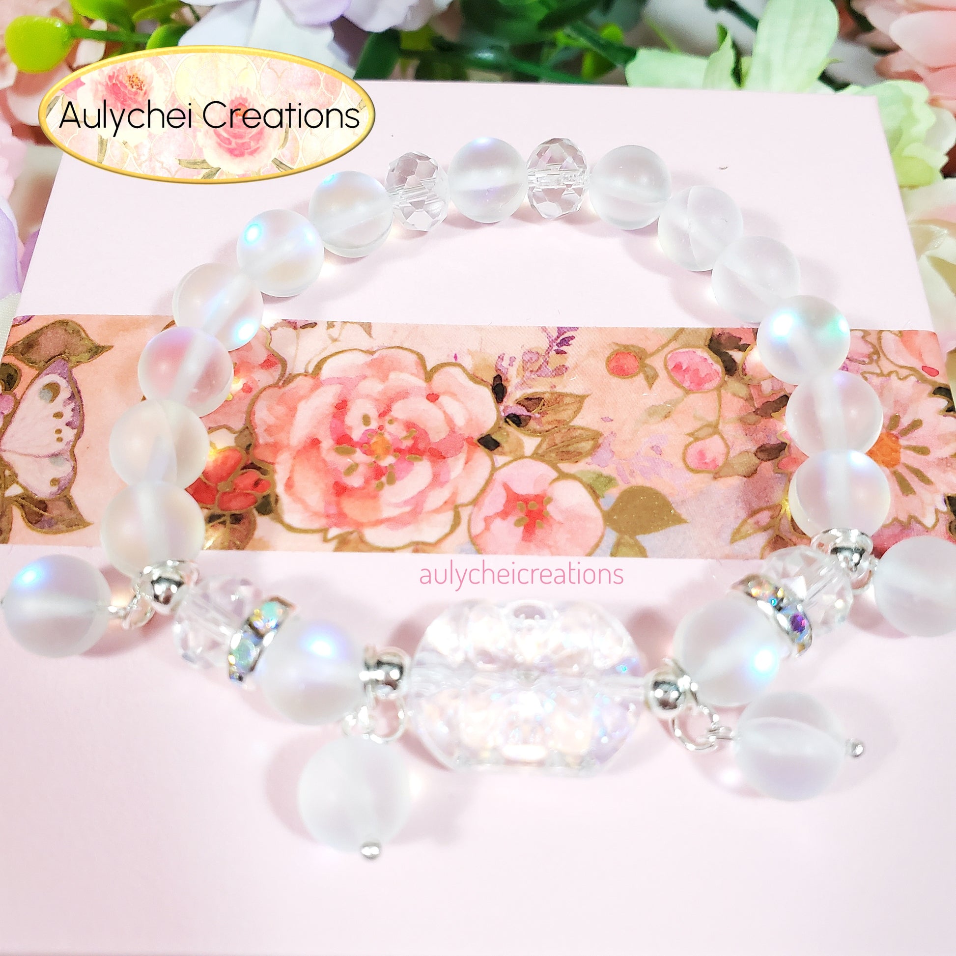 Beauty of Beads: Radiant Glowing Moonstone Beads, 18K Sterling Silver Spacers, Rhinestone Spacers, Statement Glass Flower Pendant, Minimalistic Dangle Design, Radiant Glow Day or Night, 7 - 7.5 inches fits most wrist sizes
